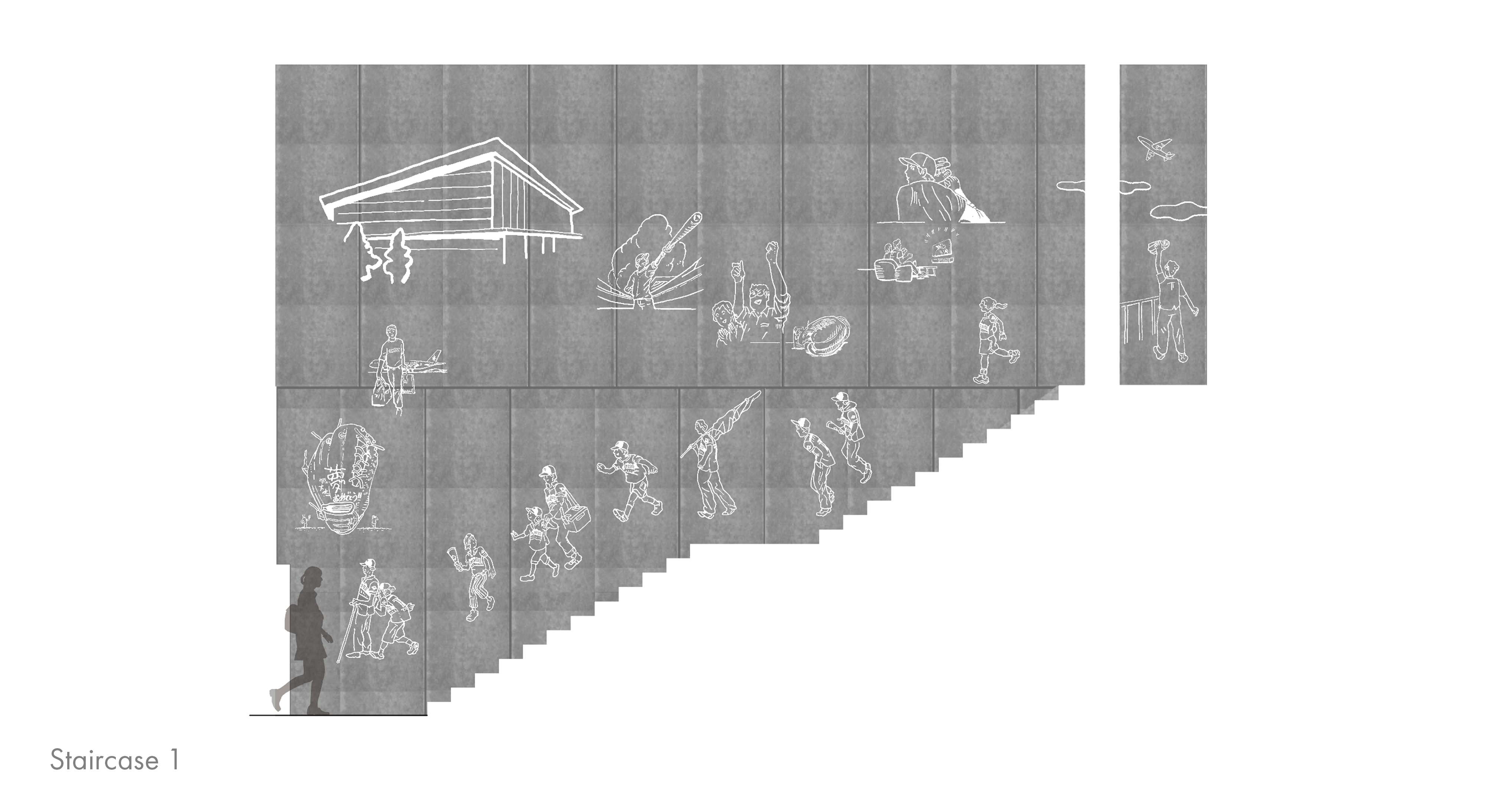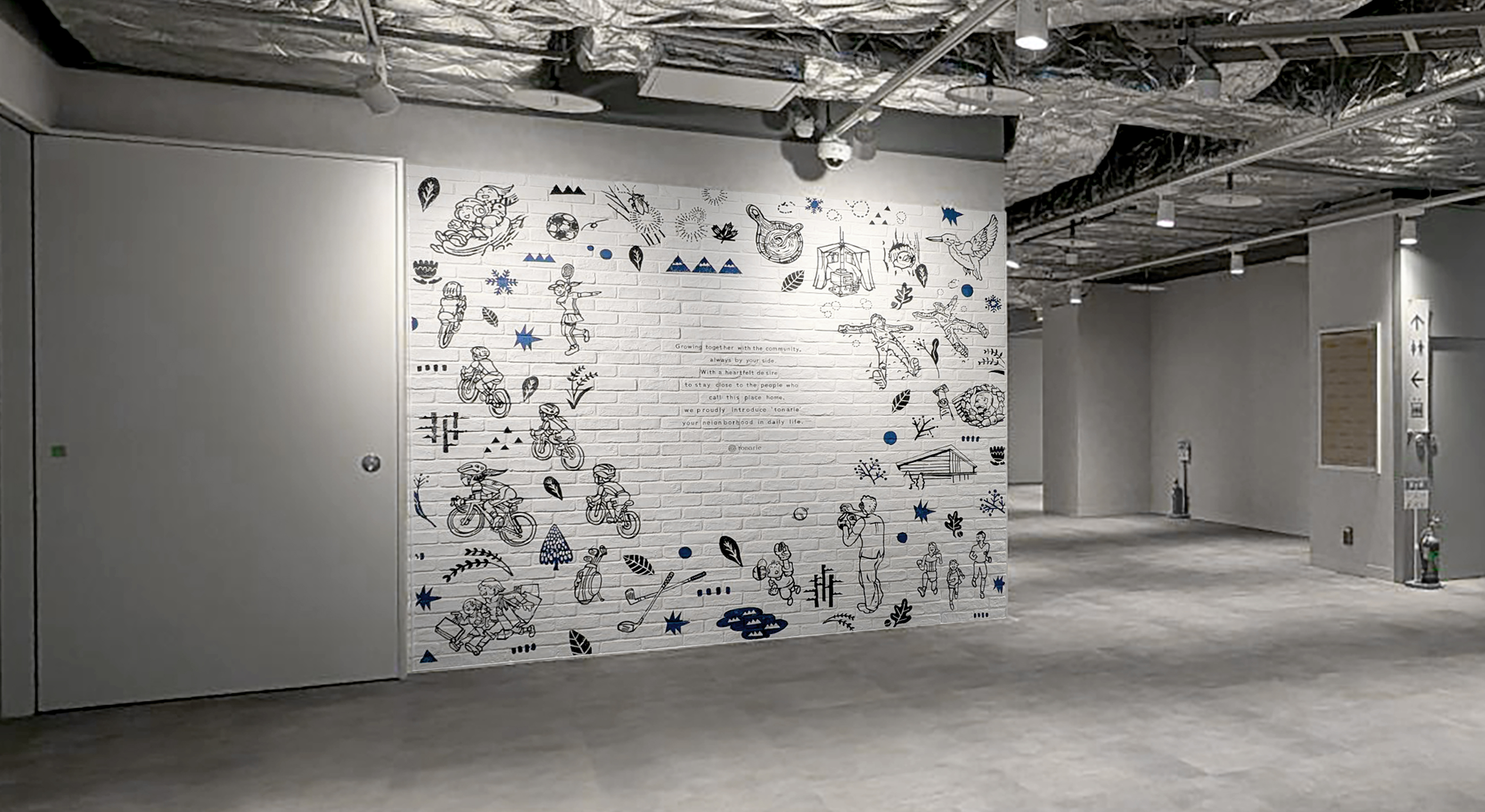 地域のPRも兼ね備えたエントランス壁から始まり、館内を歩くとストーリーを楽しめるよう工夫しました。