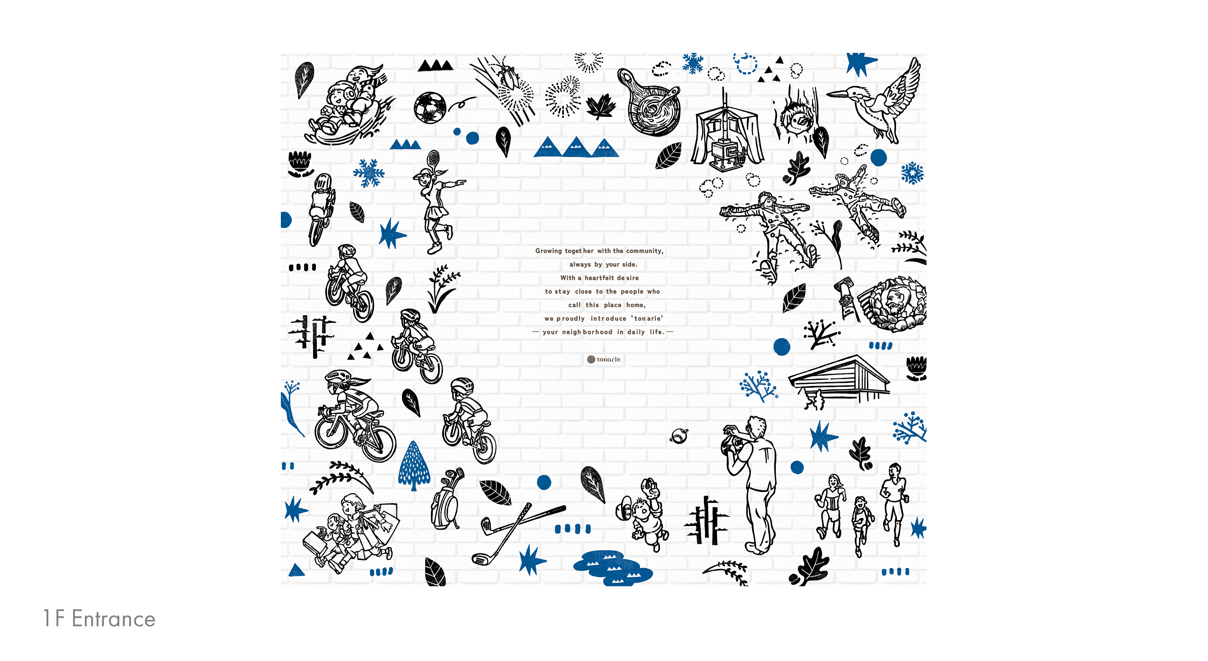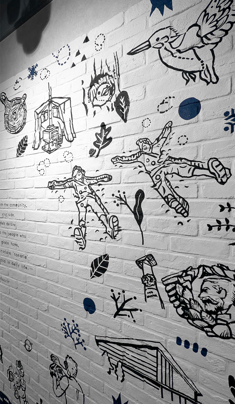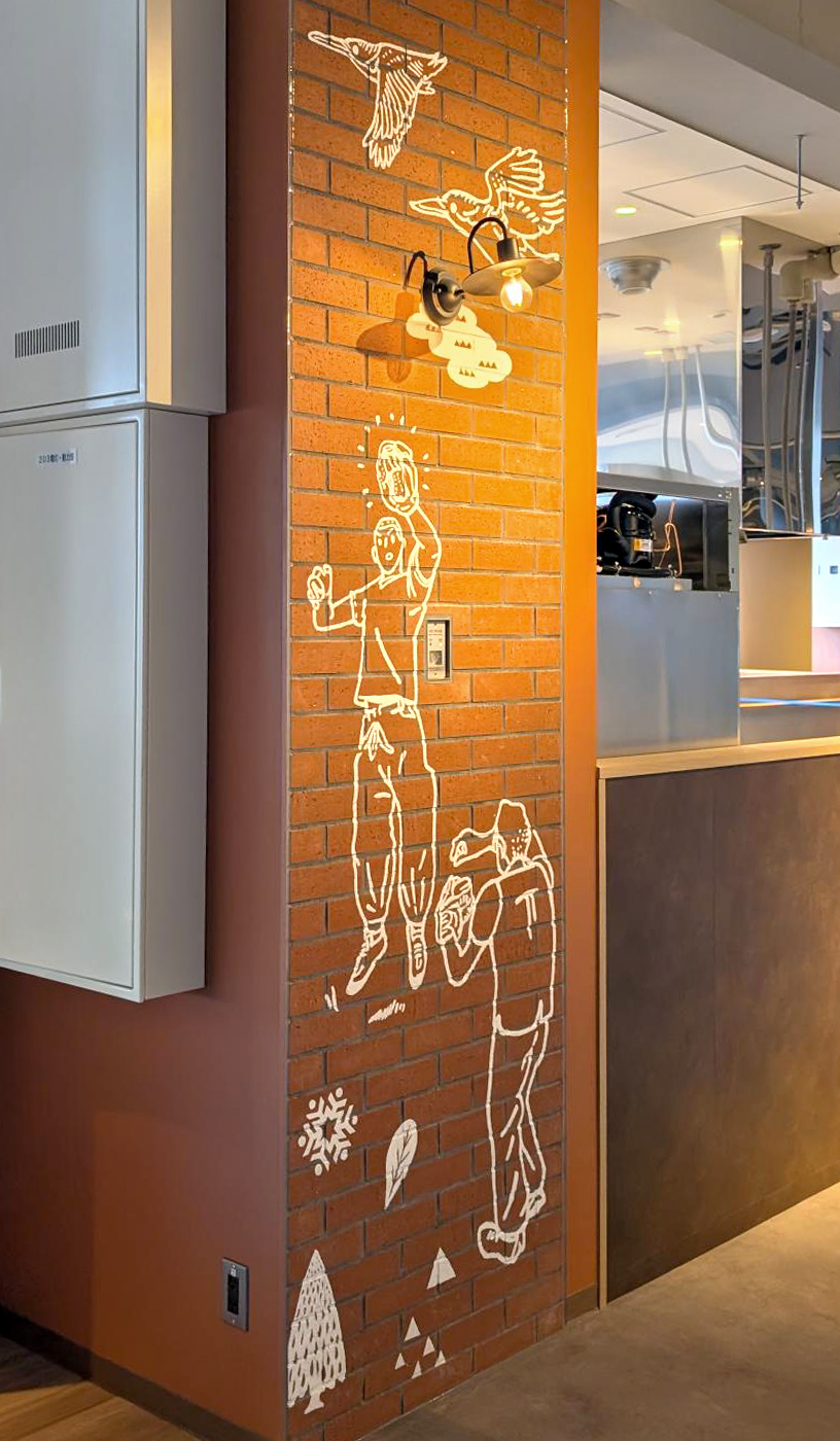 ストーリーの扉絵となるエントランス壁のブリックタイルには版画家のT図案による版画作品をプロジェクターで壁に投影し、職人さんが描く、という合わせ技で完成した壁画です。